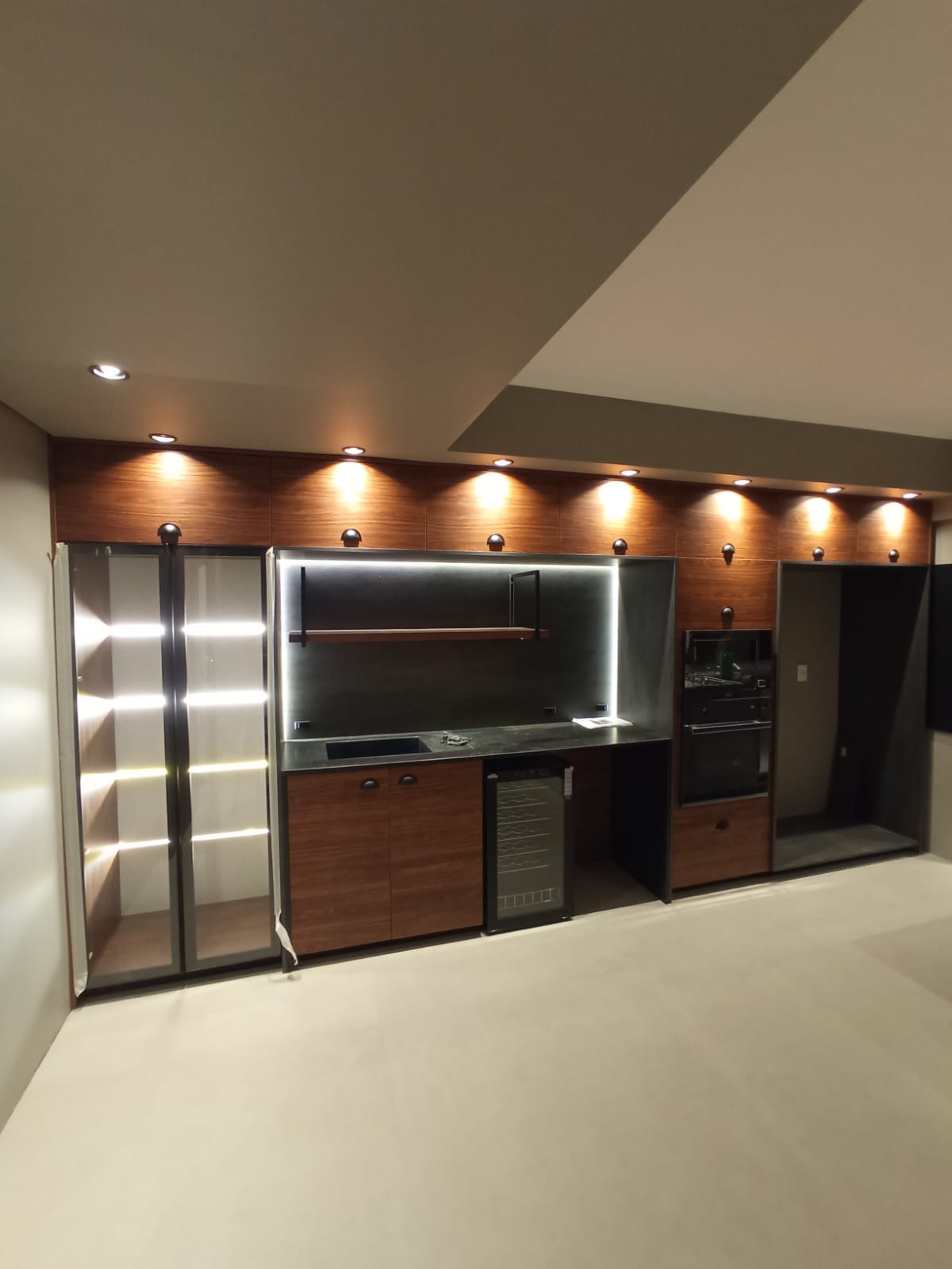 Bastidores de uma finalização de montagem deste salão de festas planejado para impactar, destaque na iluminação da ilha que confere enobrece o ambiente.