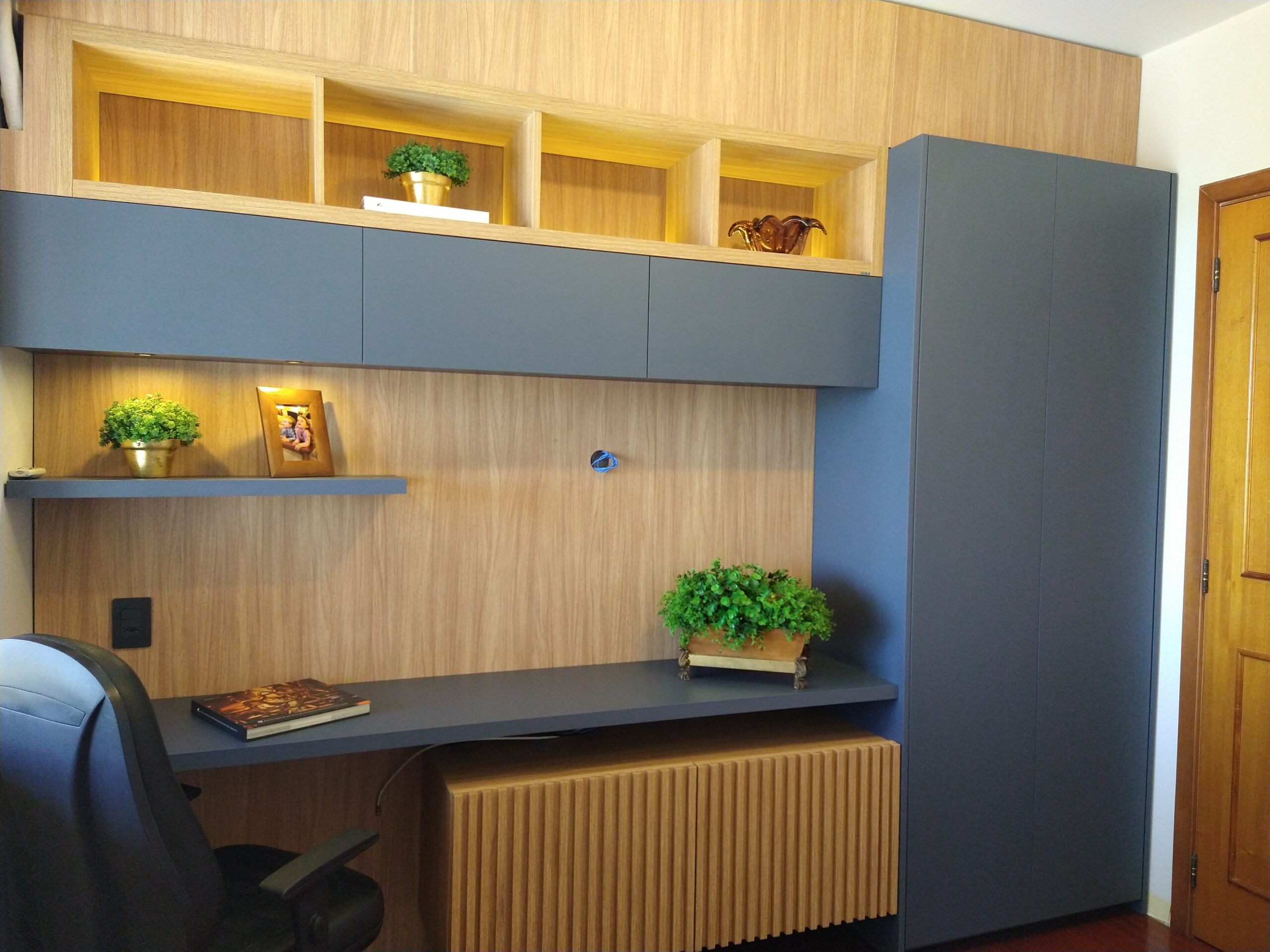 Escritório projetado para suprir as necessidades do cliente no dia a dia, com MDF em tons contrastantes que dão vida a um ambiente cheio de personalidade.